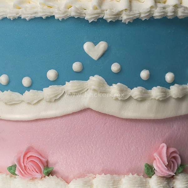Coqueto pastel de un piso en color azul con rosa, decorado en estilo vintage, cada detalle de este bonito betún está hecho con betún de la mejor calidad.