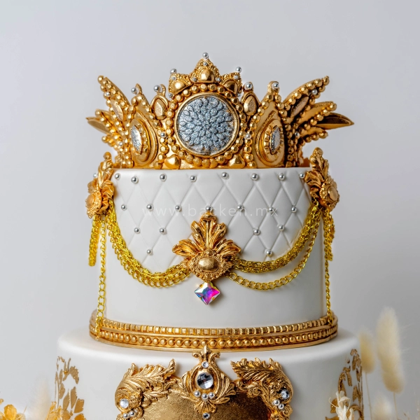 Este pastel personalizado de 15 años en tres pisos inspirado en el estilo Dior destaca por su elegante acabado en blanco perla con incrustaciones en fondant dorado que simulan oro. La pedrería aporta un toque de alta moda, mientras que la corona en la parte superior eleva el diseño con presencia y lujo, ideal para una quinceañera que desea una fiesta llena de glamur