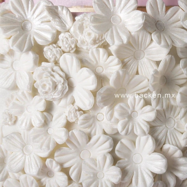 ¿Se acerca una fecha especial? Crea recuerdos hermosos para este día tan importante con un pastel hecho a tu medida. Este pastel de dos pisos tiene una textura de pequeñas flores blancas detalles dorados y grandes flores blancas con finos pétalos de Fondant. ¡Le tomarán más fotos al pastel que a la festejada!