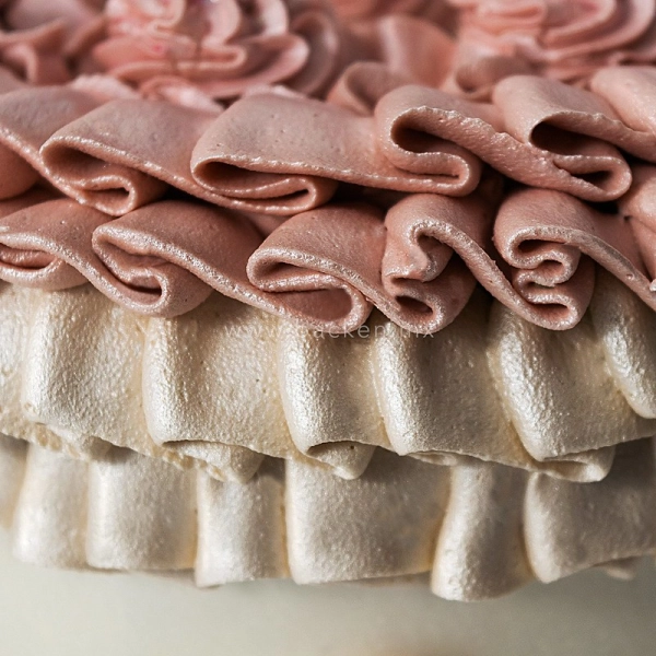 Hermoso pastel aesthetic en color blanco con rosa decorado con un estilo vintage, en la parte alta cerezas escarchadas con brillantina comestible agregan un toque coqueto inigualable.