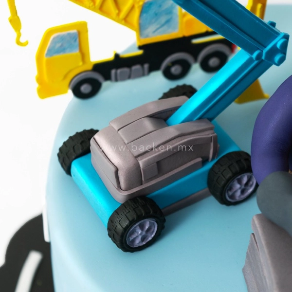 Al fondo del pastel muestra un elevador, también hecho de fondant, que añade profundidad y contexto a la imagen. Este elevador, en colores azul y amarillo, parece haber sido extraído directamente de una obra en construcción, proporcionando un escenario auténtico para nuestro soldador. Las líneas y los detalles del elevador están tan bien hechos que casi se puede sentir la estructura de metal frío y robusto.