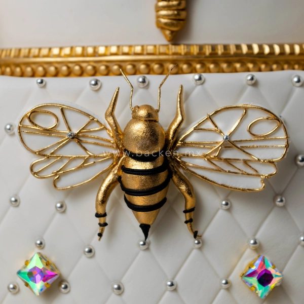 Este pastel personalizado de 15 años en tres pisos inspirado en el estilo Dior destaca por su elegante acabado en blanco perla con incrustaciones en fondant dorado que simulan oro. La pedrería aporta un toque de alta moda, mientras que la corona en la parte superior eleva el diseño con presencia y lujo, ideal para una quinceañera que desea una fiesta llena de glamur